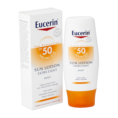 Eucerin Loción Solar extra-light es un protector solar con factor de protección alto, de fácil aplicación recomendado para pieles sensibles reactivas al sol.