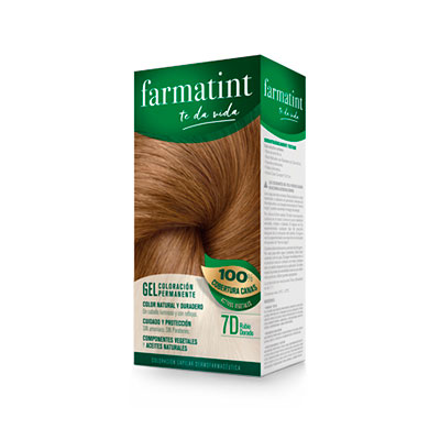 Farmatint 7D Rubio Dorado aporta coloración permanente cubriendo el 100% de las canas, fortaleciendo el cabello y proporcionando un tono de color natural.