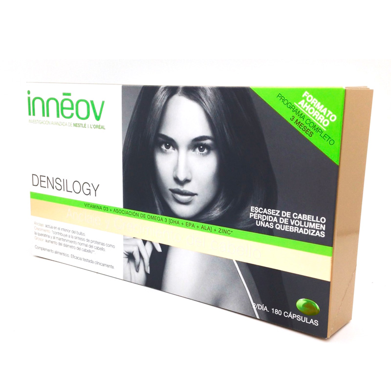 Inneov Densilogy actúa sobre la “membrana vital” en la cual se encuentra anclado el cabello, esta membrana protege el bulbo cuando está en fase de crecimiento. Es un complejo único en su tipo basado en la vitamina D, diversos ácidos grasos esenciales como el zinc y el Omega 3 necesarios para actuar en la parte inferior del bulbo y así favorecer el anclaje y el crecimiento del cabello.