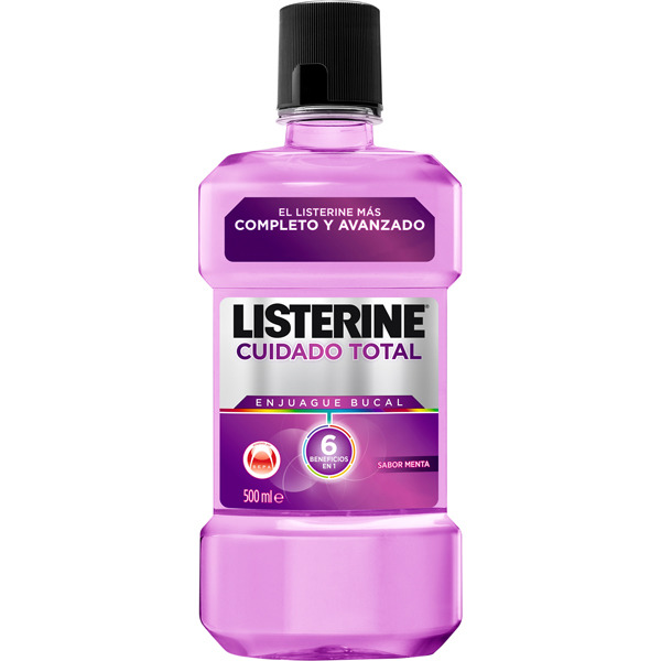 Listerine cuidado total, es un colutorio con ingredientes limpiadores de efecto antiséptico, calmante y protector de la mucosa bucal, de los dientes y de la salud bucodental en general. Su acción antibacterial ayuda a prevenir las aftas, cuida el esmalte y penetra hasta las zonas interdentales, evitando que se acumulen residuos de alimentos que pueden causar molestias y daños en los dientes. Combate la placa y el mal aliento producido por sustancias que se quedan fijas en la corona.