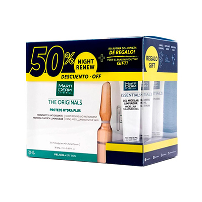 Pack Martiderm Proteos Hydra Plus 30 Ampollas piel seca + REGALO limpieza facial: tres minitallas para limpieza facial: gel micelar 15ml, exfoliante facial 15ml e hidro-mask 15ml.