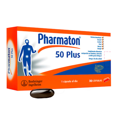 Pharmaton 50 plus está compuesto por una fórmula que aporta vitaminas, minerales y ácidos grasos Omega 3, que ayudan a buen funcionamiento del sistema inmunológico y del corazón. Fortalece y mantiene saludable la vista, los huesos y el cerebro mientras le ofrece agilidad y movimiento a los mismos. Los niveles de energía que aporta evitan la fatiga y el cansancio mientras ayuda a mantener la masa muscular. Es fácil de digerir.