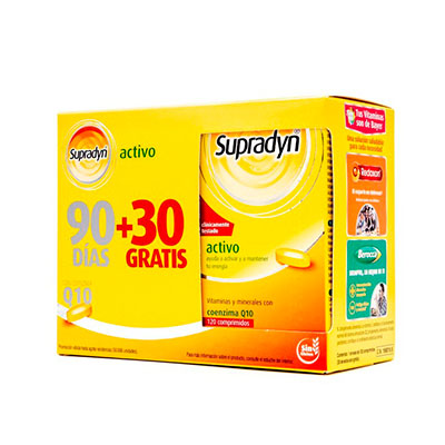 Supradyn activo 90 comprimidos que trae adicional 30 comprimidos, es un pack ahorro de 120 cápsulas. Se hace una compra de 90 comprimidos y adicional, se les entregará 30 totalmente gratis. Con este producto se puede reforzar distintos niveles de defensa en el organismo, aporta las vitaminas que hacen falta o que están en niveles bajos y contribuye a una mejor escala en energía. Debido a su función, se recomienda tomarse a primeras horas del día debido a su aporte en coenzima q10 que ayuda a la distribución de energía.