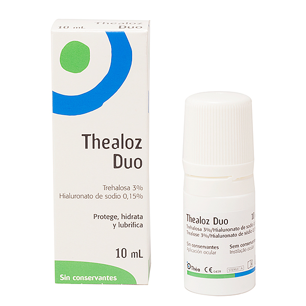 Thealoz Duo es una solución oftálmica acuosa estéril, sin conservantes ni fosfatos, isotónica y con un pH neutro. Indicada como tratamiento para el alivio de molestias, enrojecimiento o irritación y escozor de la zona ocular. Está hecho de una poderosa y eficaz combinación de trehalosa y hialuronato de sodio.
