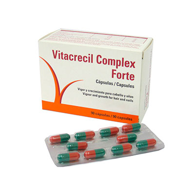 Vitacrecil Complex Forte es un suplemento vitamínico altamente recomendado. Este tratamiento en cápsulas es desarrollado por Laboratios Viña y se centra en reparar y evitar la alopecia severa, tiendo el beneficio secundario de fortalecer las uñas. Este producto es ideal para hombres y mujeres que por igual que sufren de caída del cabello de forma severa. Es recomendable su consumo en casos en que la pérdida del cabello se deba a razones como: envejecimiento, cambios estacionales, dietas inadecuadas, estrés, nerviosismo, cambios hormonales como la menopausia e incluso para actuar en contra de factores externos como radiaciones solar, contaminación, tintes, tratamientos y cambios violentos de temperatura en el ambiente.